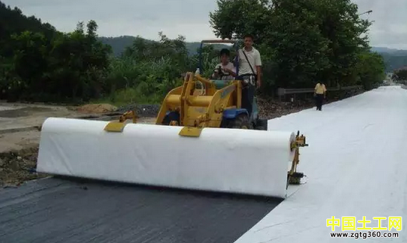 可將瀝青浸漬土工布改成噴灑瀝青結(jié)合油,將土工布牢固地滾壓在上面,再噴一薄層瀝青增加對面層的粘合度,提高防水性。若使用攤鋪機(jī)鋪設(shè)瀝青混凝土面層時(shí),可不噴面層瀝青,只在底面加大瀝青用量,控制在1000g/m2左右。經(jīng)碾壓后,瀝青會通過其孔隙透過土工布,反滲到面層。形成一道密封的防水層,同時(shí)還起到加筋作用。